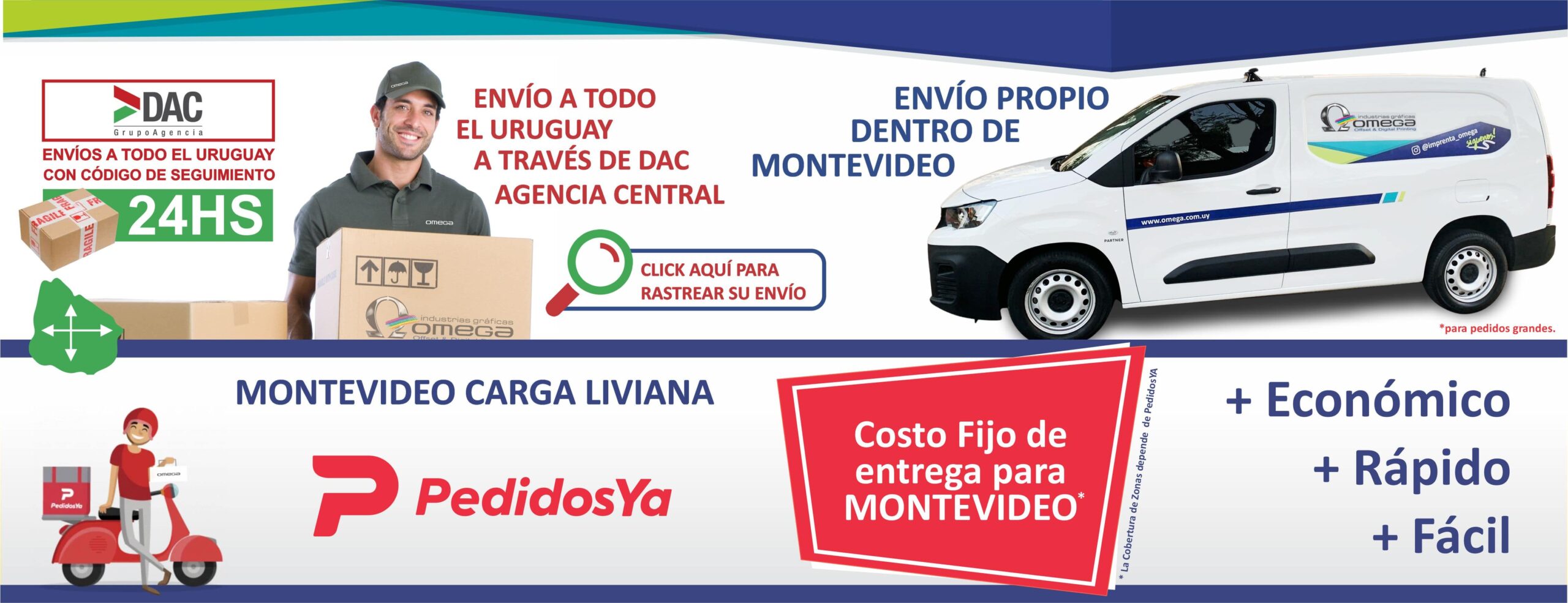 2) Para paquetes de mediano y pequeño volumen tenemos la opción del envío por PedidosYA a un costo fijo de $ 300 + IVA. Servicio válido únicamente para Montevideo, para las zonas operativas del servicio de PedidosYa, para envíos de hasta 10Kgs y tamaño de hasta 44x44x50 cm.