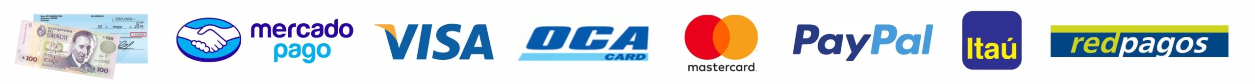 Otros medios de pago que aceptamos son, contado-efectivo, cheque al día o diferido, MercadoPago, PayPal, Visa, OCA, American Express, transferencias Itaú. Salvo las trasferencias y mercado pago, otros medios de pago deben ser acordados de manera previa a la realización de un trabajo y el mismo debe ser abonado de manera anticipada en su totalidad.